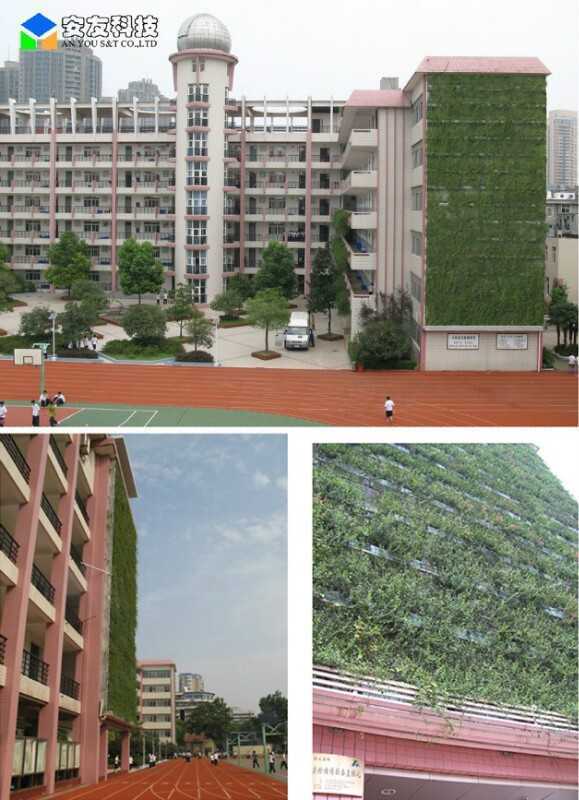 室外立體綠化技術應用于學校的作用和意義在于:一、可以更大限度地節約學校的綠化用地,用于室外教育活動;二、學校屬于人員集中的場所,在墻面或者屋頂上種植植物可以最大程度地消除人為對綠化成果的破壞。同時建筑物立體綠化相對不受干擾的生長條件,能夠為鳥類等物種傳播者提供更適宜的棲息地,因此也更容易形成自循環式的小型生態系統;三、在建筑物表面種植植物可以最大限度降低自然因素,如烈日、風蝕、雨水等,對建筑物的長年侵蝕作用,延長教學設施的使用壽命,同時降低室內溫度3~5度,節約了能源;四、安友設計安裝的自動灌溉系統可以為學校節約更多的人力和財力消耗。五、為學生們擁有更清新的學習環境提供更好的條件。